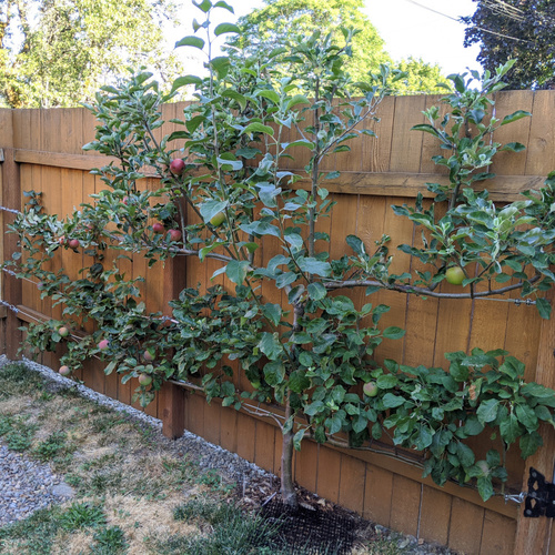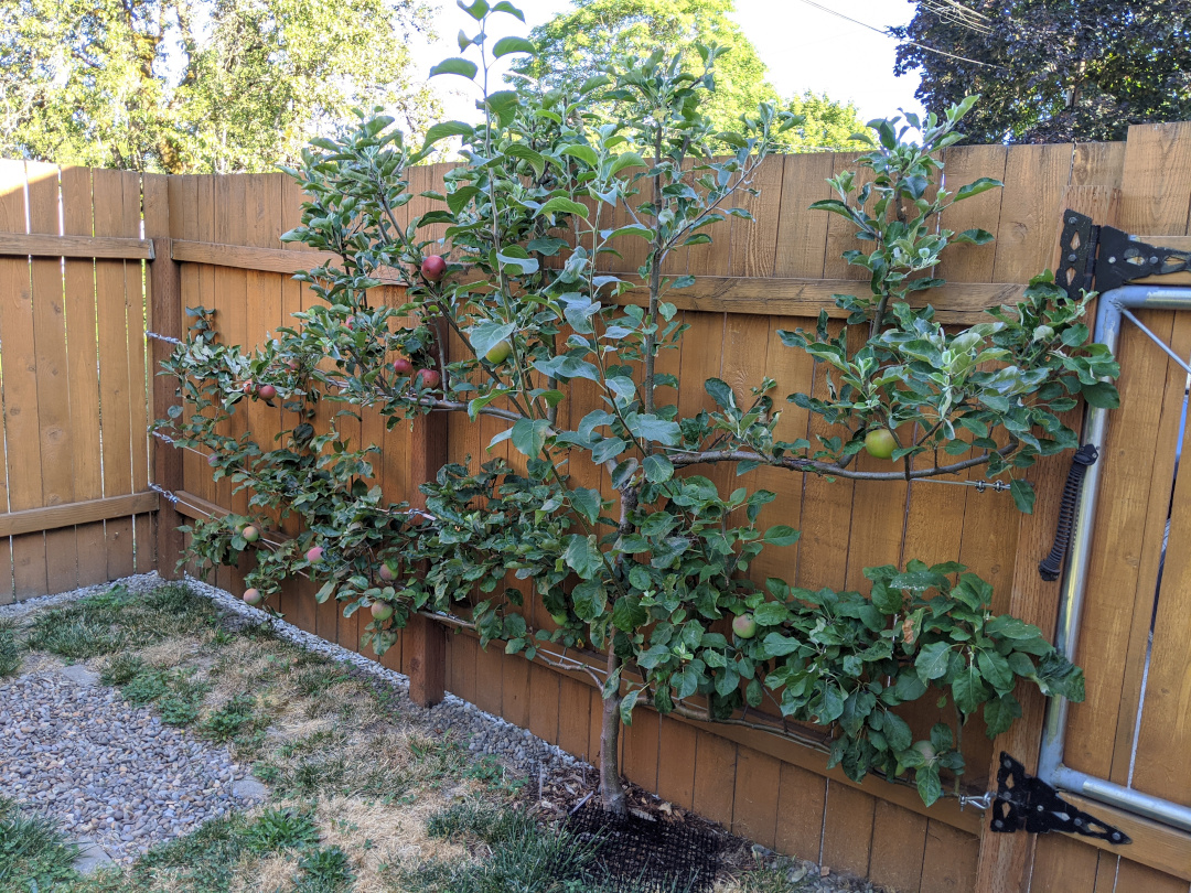 espalier apple treeWe lined part of the fence with a small espalier apple tree. The tree is grafted so that each of the three rows is a different variety of apple. Our dog’s favorite is the Honeycrisp! (Want to learn more about making espaliers? Check out this article.)